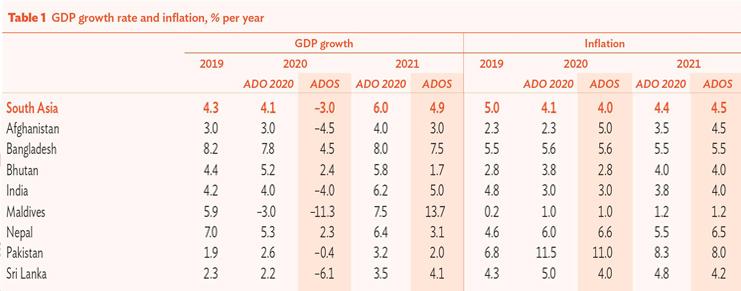 एडीबीका अनुसार यस वर्ष दक्षिण एशियाका ८ मध्ये ५ वटा देशको आर्थिक वृद्धिदर ऋणात्मक र ३ देशको सकारात्मक हुने बताएको छ । जसमा नेपाल, भुटान र बंगलादेशको मात्र आर्थिक वृद्धिदर सकारात्मक हुने जनाएको छ ।