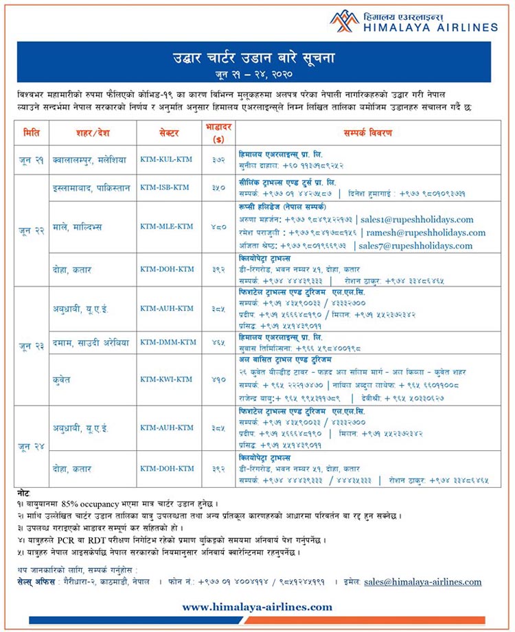एयरलाइन्सले आइतबारदेखि बुधबारसम्म विभिन्न देशबाट उक्त उडान गर्ने भएकोहो । हिमालयले आइतबार मलेसियाको क्वाललम्पुरबाट काठमाडौं चार्टर्ड उडान गर्ने भएको छ ।