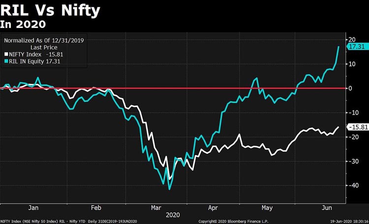 कोरोना महामारीका कारण विश्वका अधिकांश कम्पनीहरुको सेयर मूल्यमा गिरावट आइरहेको भए पनि रिलायन्सको सेयर मूल्य तीव्र गतिमा बढेर हालसम्मकै उच्च विन्दुमा पुगेको छ ।