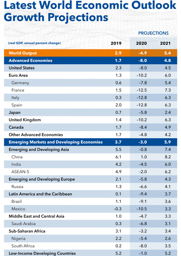 यसवर्ष विश्वकै ठूला अर्थतन्त्र भएको अमेरिकाको आर्थिक वृद्धि ८ प्रतिशत ऋणत्मक हुने कोषको प्रक्षेपण छ । यस्तै विश्वका ठूला अर्थतन्त्र भएका जर्मनीको ७.८, फ्रान्सको १२.५, इटाली र स्पेनको १२.८, जापािनको ५.८ ऋणात्मक हुने प्रक्षेपण गरेको छ ।