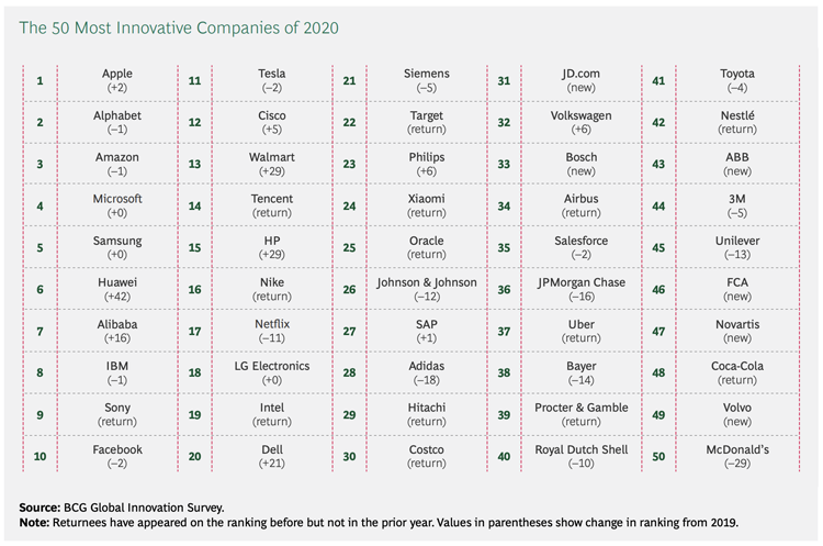 बीसीजीका अनुसार सन् २०२० का इनोभेटिभ कम्पनीको सूचीमा दोस्रोमा अल्फाबेट, तेस्रोमा अमेजन चौथोमा माइक्रोसफ्ट, पाँचौमा सामसुङ रहेका छन् ।