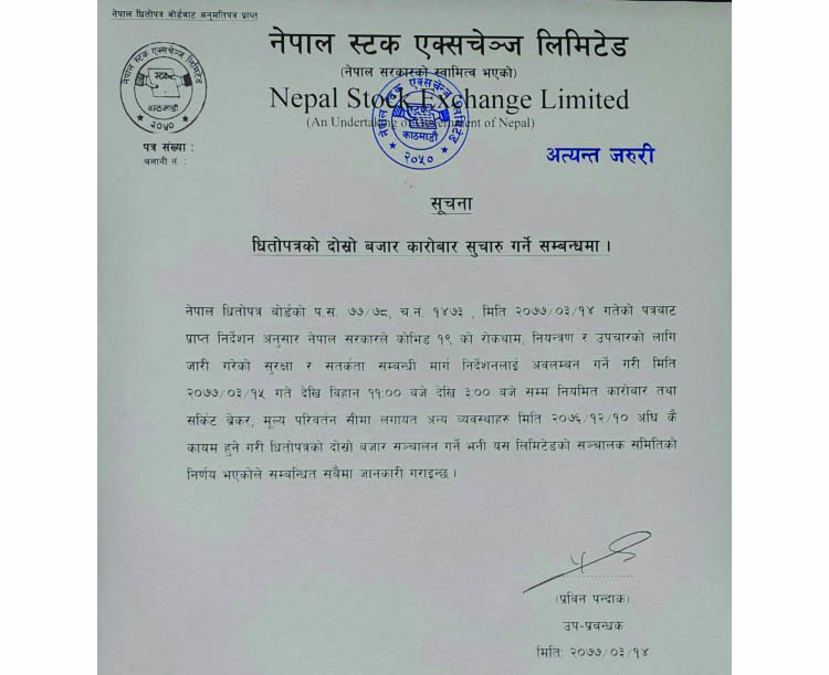 आइतबार बसेको नेपाल धितोपत्र बोर्ड संचालक समितिको बैठकले सेयर कारोबार गर्न नेपाल स्टक एक्सचेन्ज (नेप्से)लाई निर्देशन दिएसँगै आजदेखि बजार खुल्ने निश्चित भएको हो ।