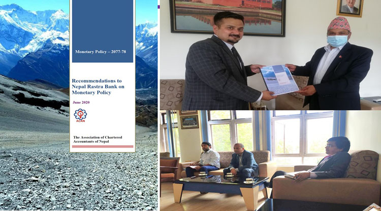 वालुवाटारस्थित राष्ट्र बैंक कार्यालयमा गभर्नर महाप्रसाद अधिकारीलाई भेटेर एक्यानका पदाधिकारीले लेखा तथा व्यवसायसँग सम्बन्धित नीतिहरुमा सहजीकरणका लागि आग्रह गरेका छन्।