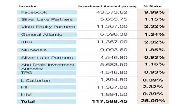 यसैगरी अबुधाबी इन्भेष्टमेन्ट अथोरिटी, टीपीजी, एल क्याटरटन तथा पीआइएफले पनि जियोमा लगानीको घोषणा गरेको छ। योसँगै जियोमा लगानी गर्ने जम्मा कम्पनीको संख्या १२ पुगेका छन्।