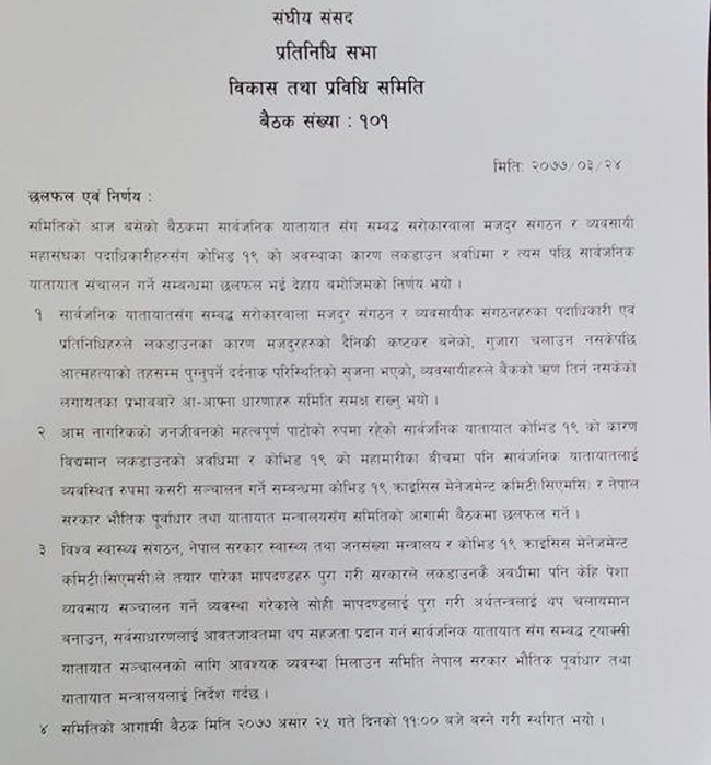 यस्तै सार्वजनिक सवारी सञ्चालनका विषयमा भने फेरि असार २५ गते समितिको अर्को बैठक बस्ने छ ।