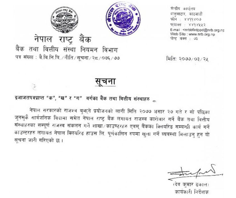 राष्ट्र बैंक नियमन विभागले एक सूचना जारी गर्दै सरकारको राजश्व बुझाउने प्रयोजनाका लागि शनिबार तथा सार्वजनिक बिदाका दिनमा समेत बैंकका शाखा खोल्न निर्देशन दिएको हो ।