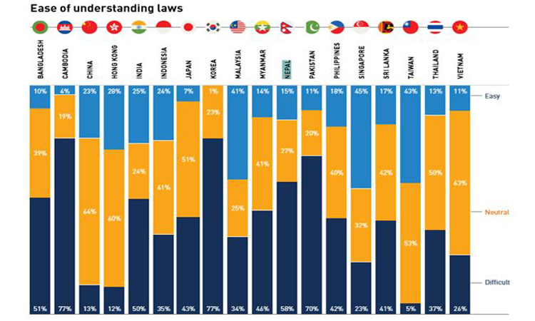 –कानूनमा उल्लेखित व्यवस्थाको स्पष्टतामा पनि नेपालको अवस्था कमजोर छ । ५८ प्रतिशत कानुनी व्यवस्था सहजै बुझन् नसकिने छन् भने १५ प्रतिशत मात्र स्पष्ट बुझ्न सकिन्छ