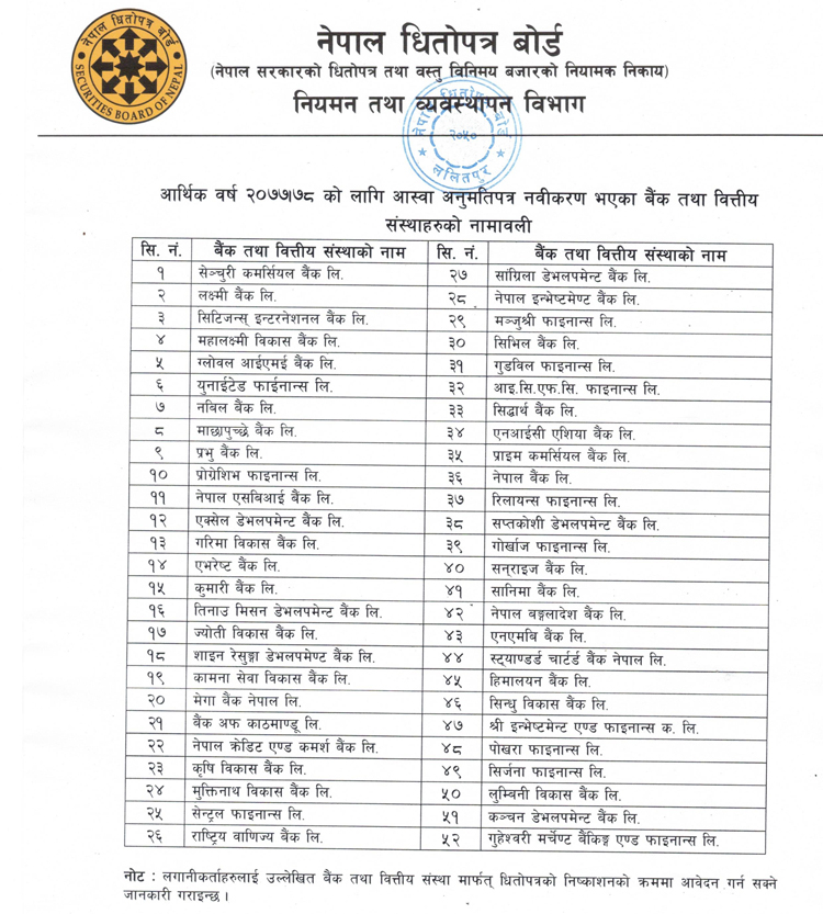 नेपाल धितोपत्र बोर्डका अनुसार चालू आवका लागि २७ वटै वाणिज्य बैंक, १३ विकास बैंक र १२ वटा फाइनान्स कम्पनीहरुले सेवा नवीकरण गराएका हुन् ।