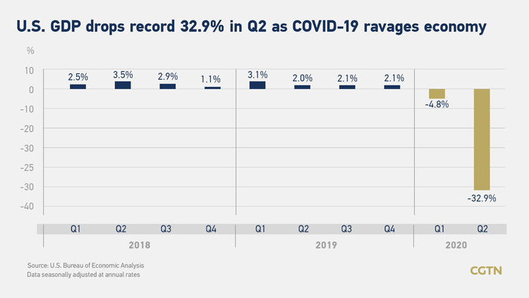 कोरोना भाइरस महामारीबीच अप्रिलदेखि जुनसम्मको अवधि (दोस्रो त्रैमासिक)मा अमेरिकी अर्थतन्त्रमा गिरावट आई ३२.९ प्रतिशत संकुचित भएको सरकारले जनाएको छ ।