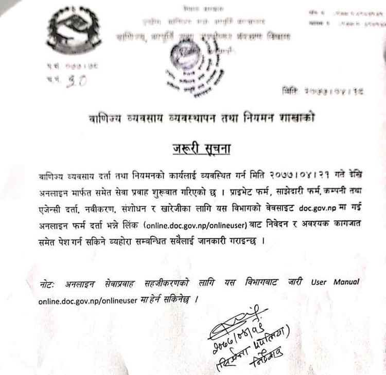 कोरोना महामारीको संक्रमण जोखिम बढिरहेका बेला विभागले ‘प्राइभेट फर्म, साझेदारी फर्म, कम्पनी तथा एजेन्सी दर्ता, नवीकरण, संशोधन र खारेजी लगायतका काम अनलाइनबाटै शुरु गरेको हो ।