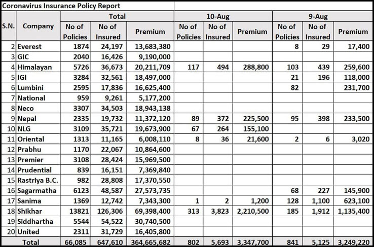 समितिका अनुसार सोमबारसम्ममा २० वटा निर्जीवन बीमा कम्पनीहरुले ६ लाख ४७ हजार ६१० जनाको कोरोना बीमा गरेका छन् ।