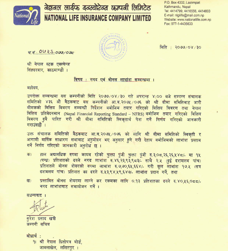 काठमाडौं । नेशनल लाइफ इन्स्योरेन्स आर्थिक वर्ष २०७५/७६ को मुनाफाबाट सेयरधनीलाई लाभांश घोषणा गरेको छ ।