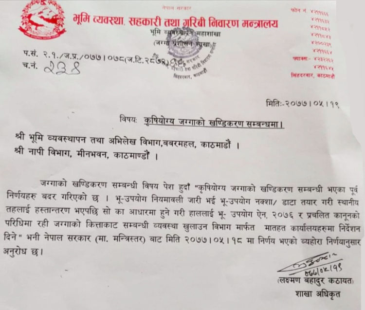 अब सरकारले कृषियोग्य जमीन भनेर तोकेका बाहेक अन्य जग्गामा कानून अनुसार प्लटिङ गर्न सकिने भएको छ । खेतीयोग्य जमिन जथाभावी खण्डीकरण गरिएको भन्दै तत्कालीन भूमि व्यवस्था मन्त्री गोपाल दहितले २०७४ साउनमा जग्गाको कित्ताकाट रोकेका थिए ।