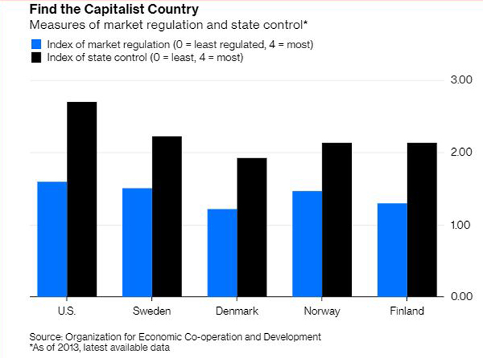 तर, ओइसिडीले गरेको स्क्यान्डनेभिएन देशहरुको सूचीकरणमा यी देशहरुमा कडा नियमनकारी व्यवस्था भएको उल्लेख गरेको छ । चाखलाग्दो कुरा के छ भने, सूचकहरुले अमेरिकामा पनि उद्योगहरुको उच्च नियमनको अवस्था रहेको देखाएका छन् ।
