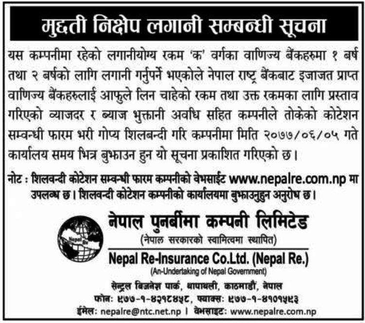 काठमाडौं । नेपाल पुनर्बीमा कम्पनीले मुद्दति निक्षेपमा पैसा राख्न बैंकहरूबाट प्रस्ताव आह्वान गरेको छ ।