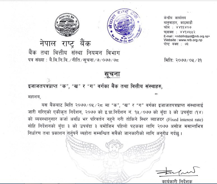 केन्द्रीय बैंकले गत साता निर्देशिका जारी गर्दै १ वर्षभन्दा बढी भुक्तानी अवधि भएका व्यक्तिगत आवधिक कर्जाहरुको ब्याजदर परिवर्तन नहुने गरी स्थिर ब्याजदर कायम गर्नुपर्ने व्यवस्था गरेको थियो। सोही अनुसार बैंकहरूले आगामी १ महिनाभित्र स्थिर ब्याजदर कायम गर्नुपर्ने भएको हो।