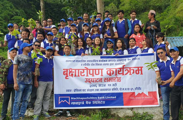 संस्थागत सामाजिक उत्तरदायित्व अन्तर्गत माछापुच्छ्रे बैंकले पोखरा महानगरपालिका वडा नं २१ स्थित दोविल्ला परिसरमा वृक्षारोपण गरेको छ । बैंकको पोखरामा रहेका शाखा कार्यालयहरु तथा पोखरा महानगरपालिका, रघैचौर टोल विकास संस्था सँगको सहकार्यमा उक्त वृक्षारोपण कार्यक्रम सम्पन्न भएको हो । बैंकले स्वच्छ वातावरण निमार्णमा सघाउ पुर्याउने उद्धेश्यले पोखरा महानगरपालीकाको सहयोगमा उक्त वृक्षारोपण कार्यक्रम आयोजना गरेको हो । उक्त अवसरमा करिव ७० भन्दा बढि विरुवाहरु रोपिएको थियो ।