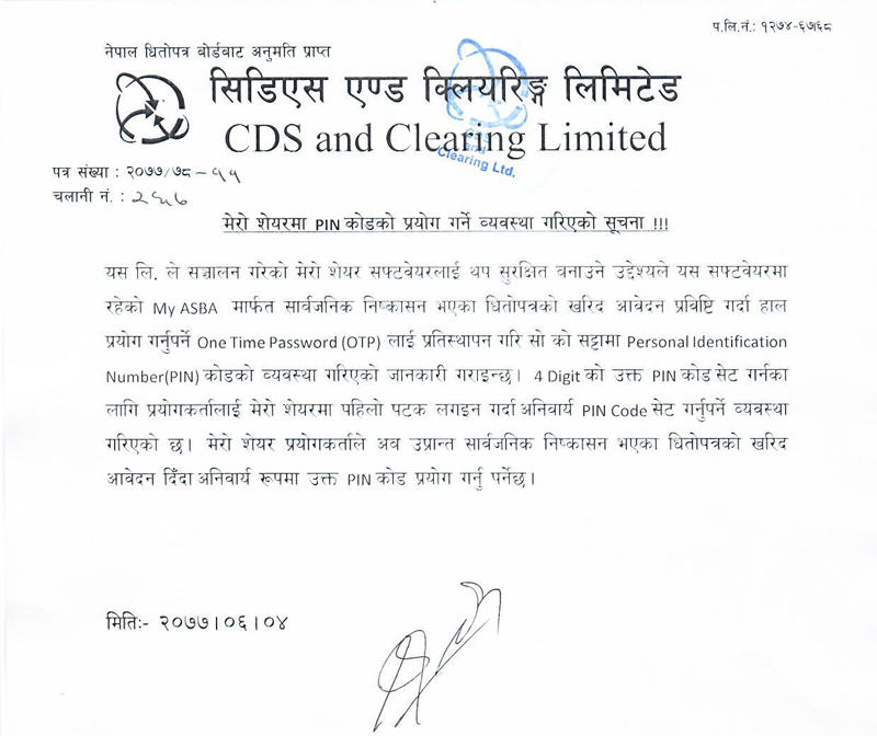 काठमाडौं । सीडीएस एण्ड क्लियरिङ्गले मेरो सेयरलाई थप सुरक्षित बनाउन पीन कोडको व्यवस्था गर्ने भएको छ ।