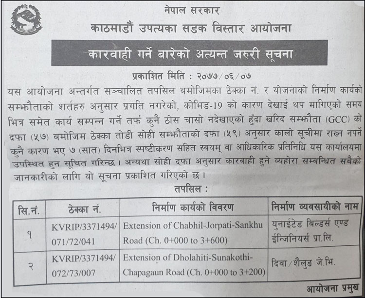 काठमाडौं उपत्यका सडक विस्तार आयोजनाले सूचना जारी गर्दै पटक–पटक थपिएको म्यादमा समेत काम सम्पन्न गर्न चासो नदेखाएके भन्दै ती कम्पनीलाई स्पष्टीकरण सोधेको हो । आयोजनाले सम्बन्धित ठेकेदार कम्पनीलाई ७ दिन भित्र उपस्थित हुन निर्देशन दिएको छ ।