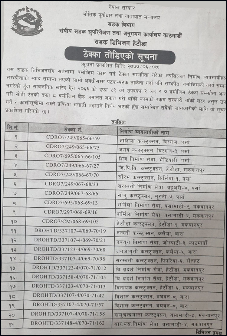 सडक डिभिजन कार्यालयले सर्तनामा बमोजिम काम गर्न ठेक्का सम्झौता गरेका २१ निर्माण कम्पनीसँगको ठेक्का अन्त्य गरिएको सूचना आज प्रकाशित गरेको हो ।