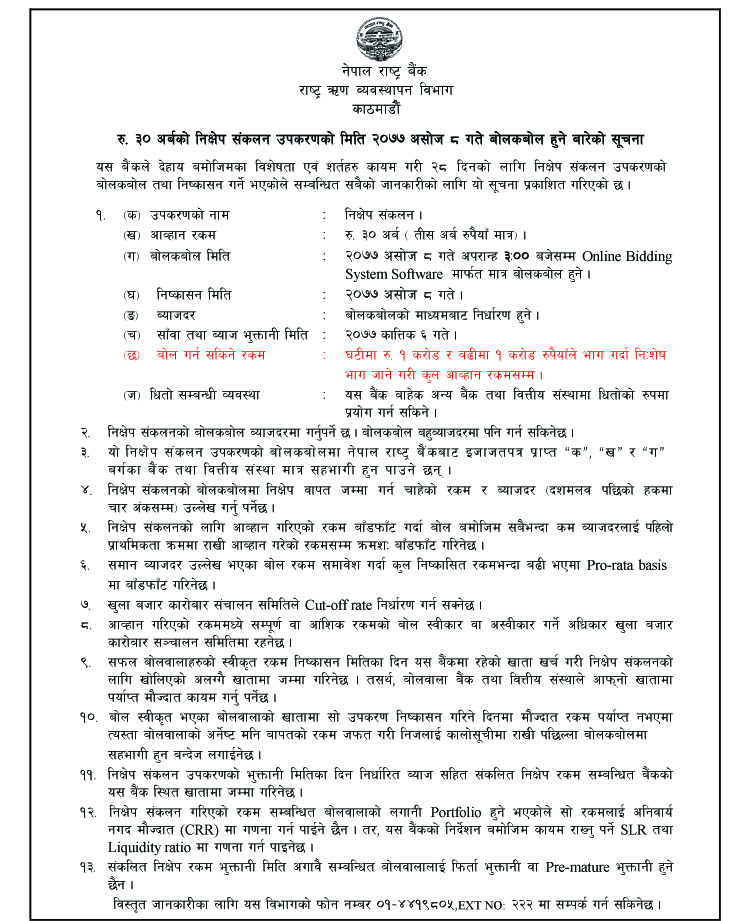 बोलकबोल बहुब्याजदरमा पनि गर्न सकिनेछ । रकम बाँडफाँट गर्दा बोलकबोल बमोजिम सबैभन्दा कम ब्याजदरलाई पहिलो प्राथमिकता क्रममा राखी आह्वान गरेको रकमसम्म क्रमशः बाँडफाँट गरिने राष्ट्र बैंकले जनाएको छ ।