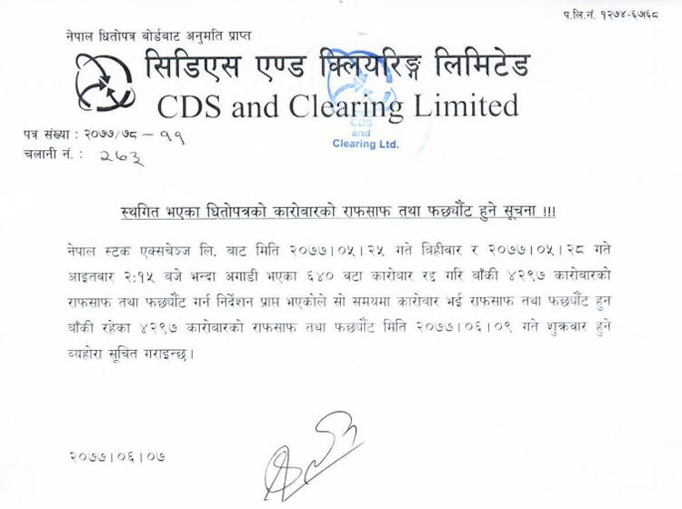 सीडीएससीले उक्त दिन सवा २ बजे अगाडि भएका ४ हजार ९३७ कारोबार मध्ये ६४० वटा रद्द गरी बाँकी ४ हजार २९७ कारोबारको राफसाफ तथा फछ्यौट गर्न नेप्सेबाट निर्देशन प्राप्त भएको जनाएको छ ।