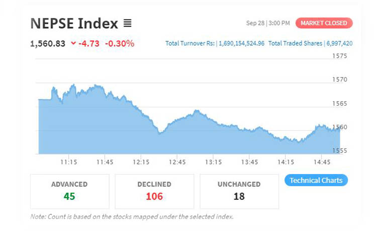 सेयर बजार मापक सूचक नेप्से ४.७३अंकले घटेर १५६०.८३ बिन्दुमा आइपुगेको छ । यसदिन १९१ कम्पनीको १ अर्ब ६९ करोड १ लाख ५४ हजार ५३४ रुपैयाँ बराबरको कारोबार भएको छ । ६९ लाख ९७ हजार ४२० कित्ता सेयर किनबेच भएका छन् ।