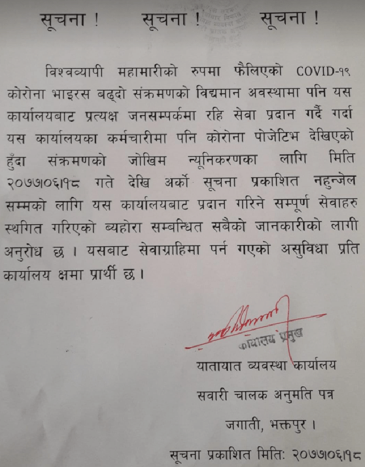 कार्यालयका केही कर्मचारीमा कोरोना संक्रमण पुष्टि भएपछि यातायात व्यवस्था कार्यालयले सूचना निकालेर असोज १८ गतेबाट भक्तपुरबाट प्रदान गरिने सम्पूर्ण सेवाहरु बन्द गरेको जानाकारी गराएको हो ।