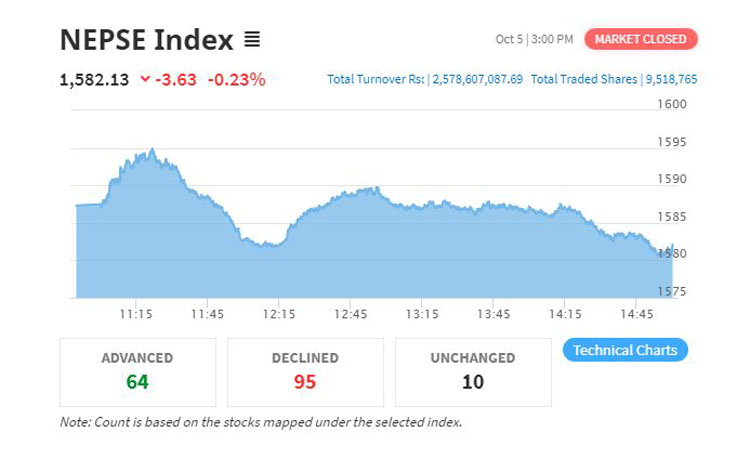 सेयर बजार मापक सूचक नेप्से आज ३.६३ अंकले घटेर १५८२.१३ बिन्दुमा आइपुगेको छ । यसदिन १९३ कम्पनीको २ अर्ब ५७ करोड ८६ लाख ७ हजार ८७ रुपैयाँ बराबरको कारोबार भएको छ । ९५ लाख १८ हजार ७६५ कित्ता सेयर किनबेच भएका छन् ।