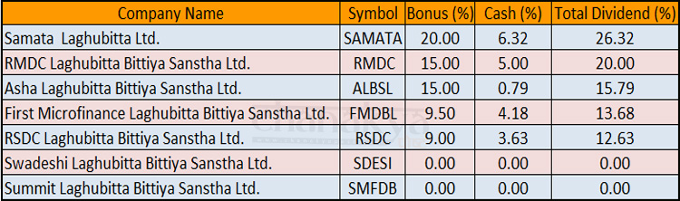 यस्तै, आरएमडीसीले १५ प्रतिशत बोनस र ५ प्रतिशत नगद गरी प्रतिशत, फस्ट माइक्रोफानान्सले ९.५० प्रतिशत बोनस र ४.१३ नगद गरी १३.६८ प्रतिशत, आशा लघुवित्तले १५ बोनस र ०.७९ नगद गरी कुल १५.७९ प्रतिशत र आरएसडीसीले ९ प्रतिशत बोनस र ३.६३ नगद गरी कुल १२.६३ प्रतिशत लाभांश वितरण गर्ने घोषणा गरेका छन्।