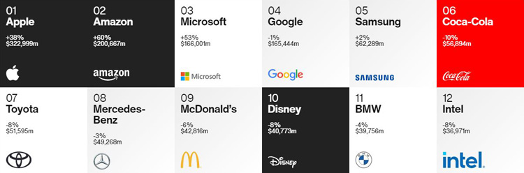 ब्रान्ड भ्यालूकै आधारमा गाडी उत्पादक कम्पनी टोयोटा सातौं, मर्सिडिज बेन्ज आठौं, फास्टफूड कम्पनी म्याक डोनाल्ड नवौं र डिज्नी दशौं स्थानमा रहेको छ ।