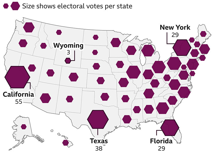 अमेरिकामा इलेक्टरल कलेज प्रणालीअन्तर्गत राष्ट्रपतिको चयन हुन्छ। सबै राज्यलाई तिनको जनसङ्ख्याका आधारमा केही मत दिइएको हुन्छ।