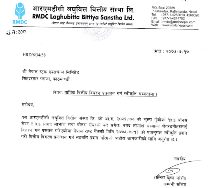काठमाडौं । आरएमडीसी लघुवित्तले गत आर्थिक वर्षको मुनाफाबाट प्रस्ताव गरेको २० प्रतिशत लाभांश वितरण गर्न नेपाल राष्ट्र बैंकले स्वीकृति दिएको छ ।