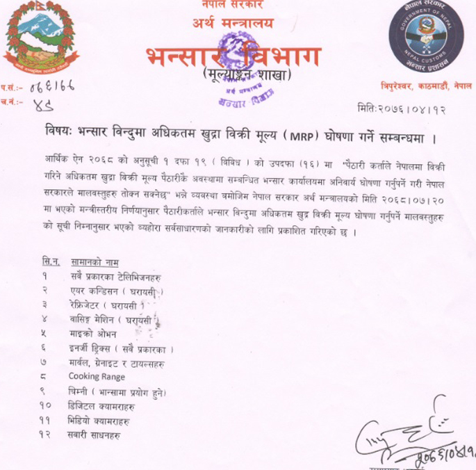 भन्सार विभागका अनुसार अबदेखि सबै प्रकारका टेलिभिजन, घरायसी एयर कन्डिसनर, घरायसी रेफ्रिजेरेटर, वासिङ मेसिन, माईक्रोओभन, शक्तिबद्र्धक जुस आयात गर्दा भन्सार बिन्दुमै खुद्रा मूल्य तोकिनेछ ।
