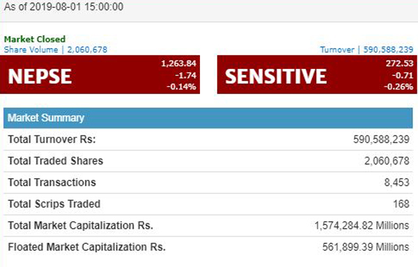 बिहीबार नेप्से सूचक १.७४ अंकले घटेर १२६३.८४ विन्दुमा आइपुगेको छ । आज १६८ कम्पनीको ५९ करोड ५ लाख ८८ हजार २३९ रुपैयाँको कारोबार भएको छ । २० लाख ६० हजार ६७८ कित्ता सेयर खरिदबिक्री भएका छन् ।