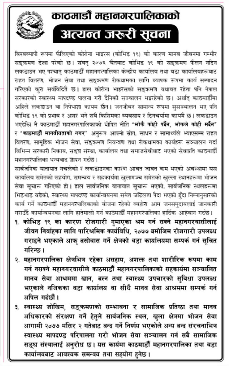 महानगरले असहाय, अशक्त तथा शारीरिक रुपमा काम गर्न नसक्ने महानगरवासीले काठमाण्डु महानगरपालिकाको सहकार्यमा सञ्चालित मानव सेवा आश्रम खान, बस्न तथा स्वास्थ्य उपचारको सविधा भएकाले नजिकका वडा कार्यालयमा वा सिधै मानव सेवा आश्रममा समपर्क गर्न आग्रह गरेको छ ।