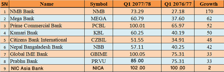 यो अवधिमा सबैभन्दा बढी नाफा एनएमबी बैंकले बढाएको छ । एनएमबीको नाफामा यो अवधिमा १७० प्रतिशतको बढोत्तरी भएको छ । अघिल्लो वर्ष २७ करोड १८ लाख खुद नाफा गरेको बैंकले यो वर्ष ७३ करोड २९ लाख रुपैयाँ नाफा गरेको हो । बैंकले यो समयमा ओम डेभलपमेन्ट बैंकलाई प्राप्ती गरेको थियो ।