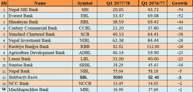 सबैभन्दा धरै नाफा नेपाल एसबीआई बैंकको घटेको छ । गत वर्ष सोही अवधिमा ४३ करोड ७२ लाख खुद नाफा गरेको बैंकले यो वर्ष २० करोड ५ लाख मात्र नाफा कमाउन सकेको छ । यो भनेको ५४ प्रतिशतको गिरावट हो ।