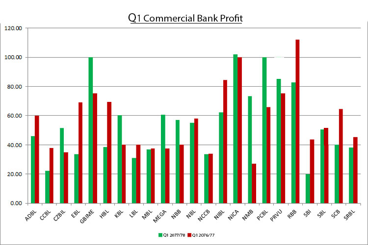 समग्रमा पनि यो चालू आर्थिक वर्षको यो त्रैमासमा अघिल्लो त्रैमासको भन्दा बैंकहरूको नाफा घटेको देखिएको छ । आजसम्म वित्तीय विवरण प्रकाशित गरेका यी २३ बैंकहरूले अघिल्लो आर्थिक वर्षको पहिलो त्रैमाससम्म १३ अर्ब ४ करोड रुपैयाँ कमाएका थिए भने यी २३ बैंकहरूले यो वर्षको सोही अविधिसम्ममा १२ अर्ब ९६ करोडमात्र कमाउन सकेका छन् ।