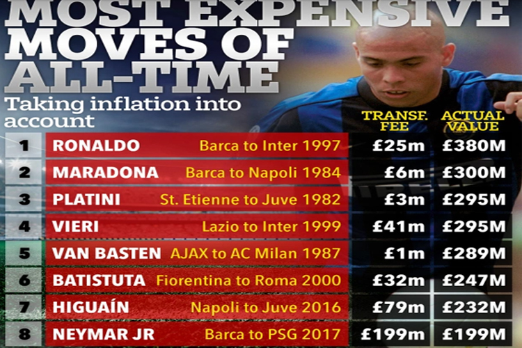 विश्व फुटबल इतिहासकै हालसम्मका महँगो खेलाडी भने ब्राजिलका रोनाल्डो हुन् । उनी सन् १९९७ मा बार्सिलोनाबाट एटालीको इन्टरमिलान जाँदा २.५ करोड पाउण्डमा गएका थिए । यो रकम भनेको अहिलेको मूल्यमा हिसाब गर्दा ३८ करोड पाउण्ड हुन आउँछ ।