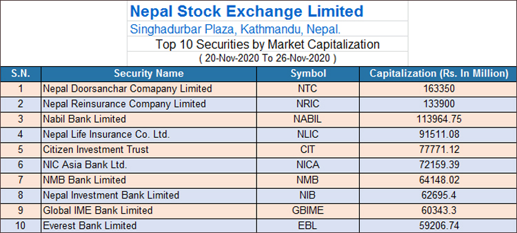 बजार पूँजीकरणका आधारमा नेपाल लाइफ ९१ अर्ब ५१ करोड, नागरिक लगानी कोष ७७ अर्ब ७७ करोड, एनआइसी एशिया बैंक ७२ अर्ब १५ करोड, एनएमबी बैंक ६४ अर्ब १४ करोड रुपैयाँ सहित क्रमशः शीर्ष सात स्थानमा रहेका छन् ।