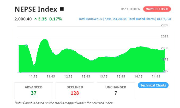 आज सेयर बजार मापक सूचक नेप्से ३.३५ अंकले बढेर २०००.४० विन्दुमा पुगेको छ । यसदिन १९७ कम्पनीको १ करोड ८५ लाख ७६ हजार ७०८ कित्ता सेयर ७ अर्ब ४० करोड ४१लाख ५४ हजार ६ रुपैयाँमा कारोबार भएको छ ।