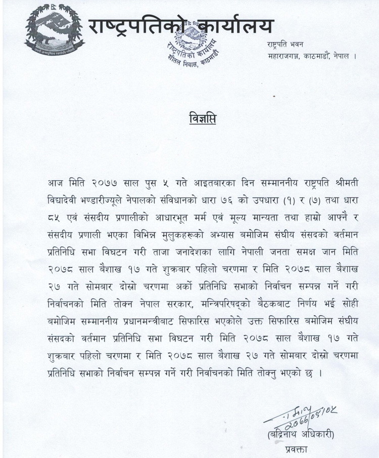 संविधानको धारा ७६ को उपधारा १ र ७ तथा धारा ८५ एवं संसदीय प्रणालीको आधारभूत मर्म एवं मान्यताको आधारमा ताजा जनादेशमा जान मन्त्रिपरिषद्बाट सिफारिस भएको राष्ट्रपति कार्यालयले जनाएको छ ।