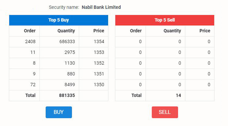 बम्पर लाभांश घोषणा गरेको बैंकको सेयर किन्न लगानीकर्ताको ओइरो लागेको छ । दुई बजेसम्म ८ लाख ८८ कित्ताभन्दा बढी खरीदका लागि माग भए पनि विक्री कर्ता भने शून्य रहेको छन् ।