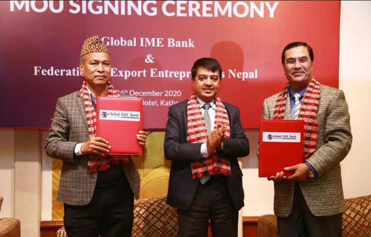काठमाडौं । ग्लोबल आइएमई बैंक र निर्यात व्यवसायी महासंघ नेपालबीच सहुलियतपूर्ण कर्जाका साथै सरल र सहज बैंकिङ्ग सेवाहरु प्रदान गर्ने सम्बन्धी सम्झौता भएको छ ।