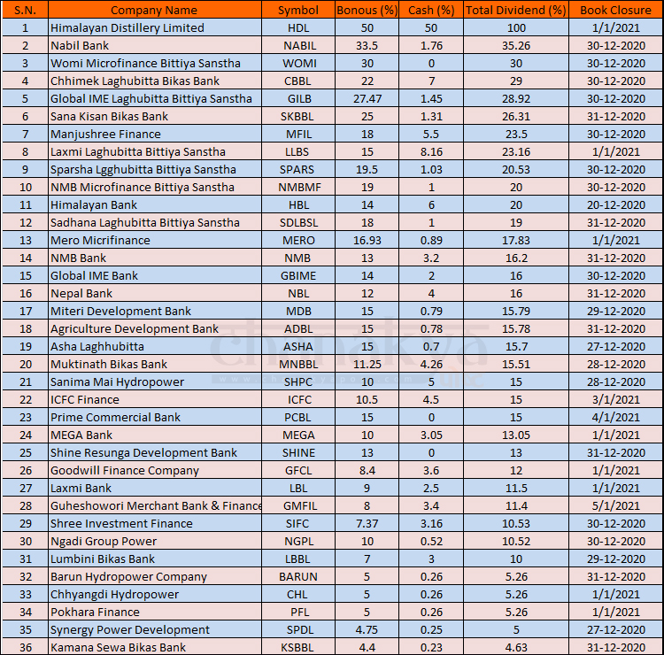 त्यसैले आफूले चाहेको कम्पनीको सेयर किनेर लाभांश सुरक्षित गर्न लगानीकर्ताहरु नछुटुन भनेर यहाँ लाभांश र बुक क्लोज मिति दुवै घोषणा गरेका कम्पनीहरुको सूची प्रस्तुत गरिएको छ ।