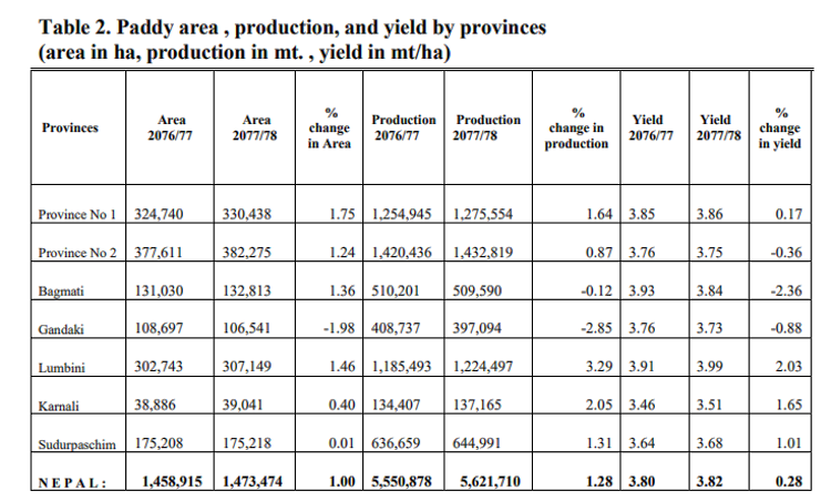कृषि तथा पशुपक्षी विकास मन्त्रालयले यो आवमा १४ हजार ५५९ हेक्टर क्षेत्रफल वृद्धि भई कुल १४ लाख ७३ हजार ४७४ हेक्टर क्षेत्रफलमा धान उत्पादन भएको जनाएको छ ।