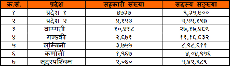 जसमा महिला ५ लाख ७६ हजार ३१२ जना र पुरुष ३२ लाख २२ हजार २९९ जना रहेका छन् । यस प्रदेशमा रहेका सहकारीको कुल सेयर पूँजी ५ अर्ब ८२ करोड २२ लाख ९७ हजार ५० रुपयाँ, कुल बचत सकलन ५९ अर्ब ९६ करोड ३७ लाख ६८ हजार ४६७ रुपैयाँ र कुल ऋण लगानी ४० अर्ब ८० करोेड ६८ लाख ४ हजार ३२ रुपैयाँ रहेको छ । यस प्रदेशमा सहकारी मार्फत ६ हजार ९८९ जनाले प्रत्यक्ष रोजगारी पाएका छन् ।