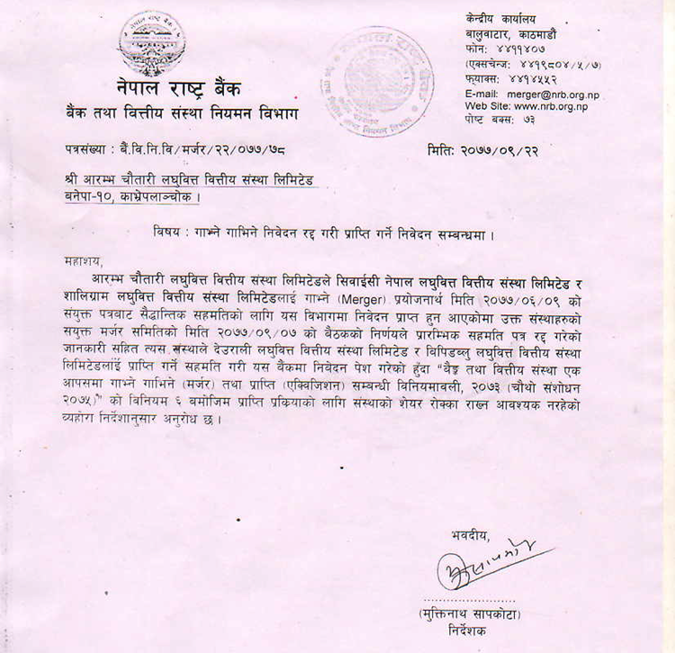 सीवासी र शालिग्राम लघुवित्तलाई गाभ्ने प्रारम्भिक सम्झौता भएपछि असोज ११ गतेदेखि आरम्भको सेयर कारोबार रोकिएको थियो।