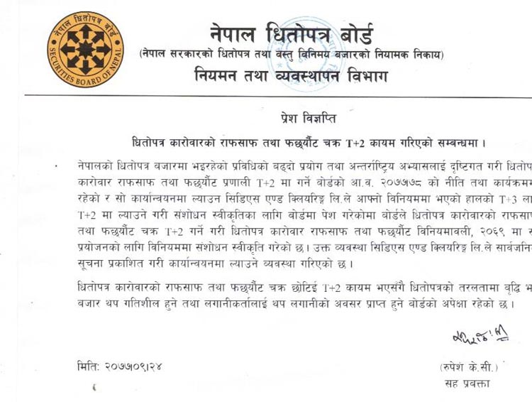 ‘धितोपत्र कारोबार राफसाफ तथा फछ्र्यौट प्रणाली टी प्लस टु मा गर्ने बोर्डको आर्थिक वर्ष २०७७–७८ को नीति तथा कार्यक्रममा रहेको र सो कार्यान्वयनमा ल्याउन सीडीएस एण्ड क्लियरिङले आफ्नो विनियममा भएको हालको टी प्लस थ्रि लाई टी प्लस टु मा ल्याउने गरी संशोधन स्वीकृतिका लागि बोर्डमा पेश गरेको थियो,’ बोर्डद्वारा जारी सूचनामा भनिएको छ, ‘सोही बमोजिम बोर्डले धितोपत्र कारोवारको राफसाफ तथा फछ्र्यौट चक्र टी प्लस टु मा गर्ने गरी धितोपत्र कारोवार राफसाफ तथा फछ्र्यौट विनियमावली, २०६९ मा सो प्रयोजनको लागि विनियममा संशोधन स्वीकृति गरेको छ ।’